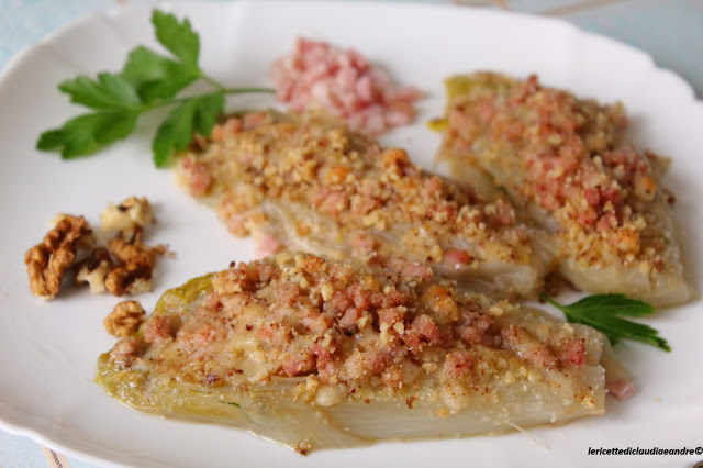 - Coprire ogni metà d’indivia belga con il composto di prosciutto preparato in precedenza.