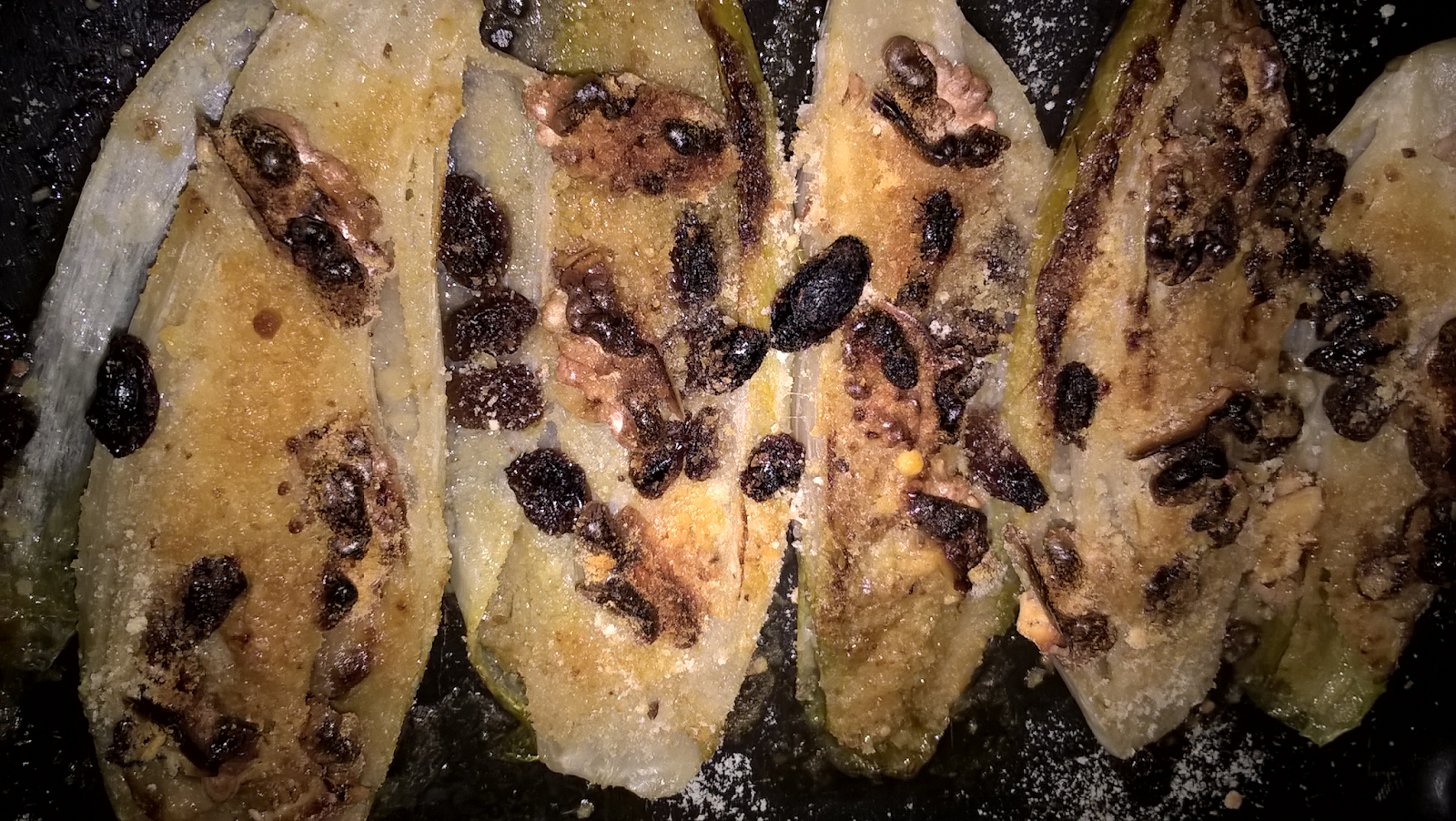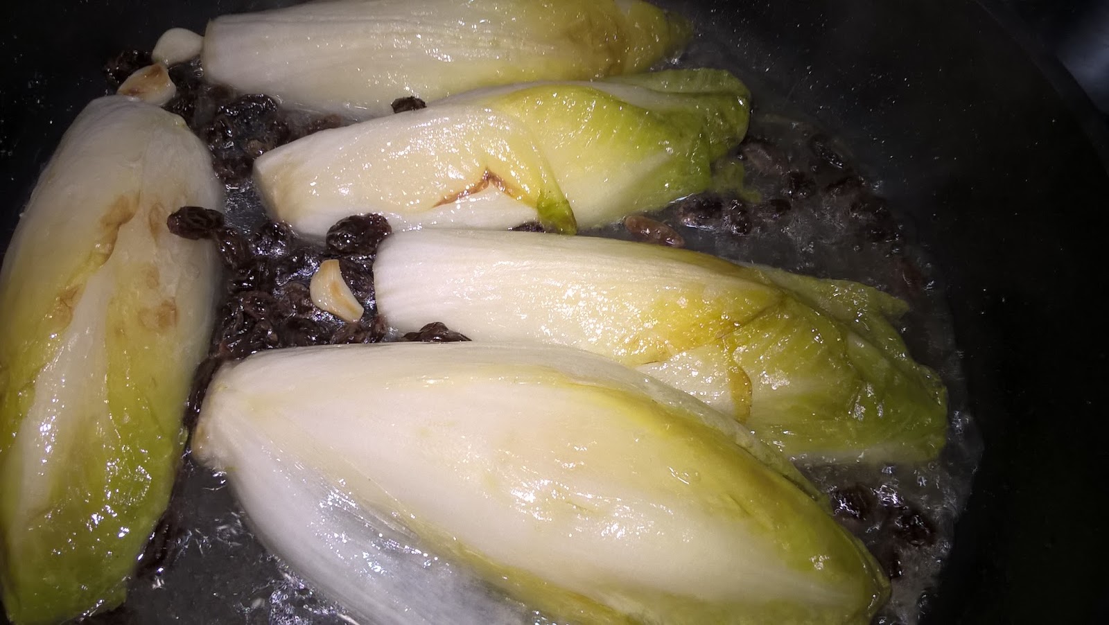 Fatela appassire leggermente in una padella con olio extravergine d’oliva, da entrambi i lati. Salate e se vi piace pepate. Aggiungere una manciata di uvetta lavata e strizzata. Sfumate con alcune gocce di aceto balsamico.