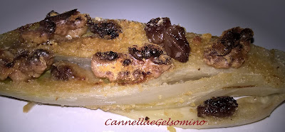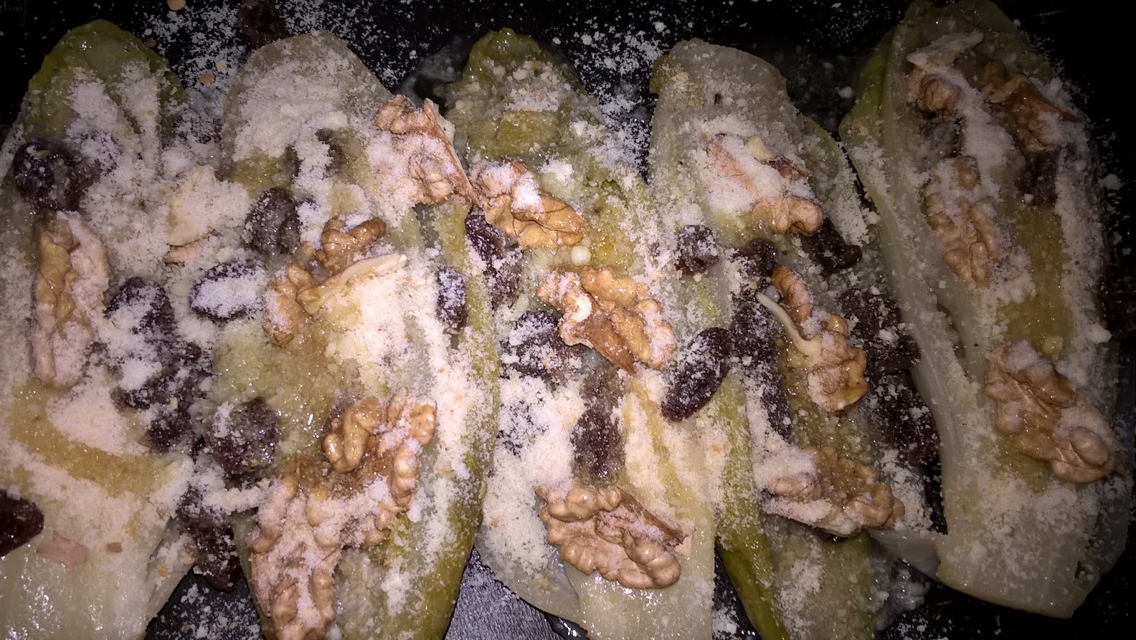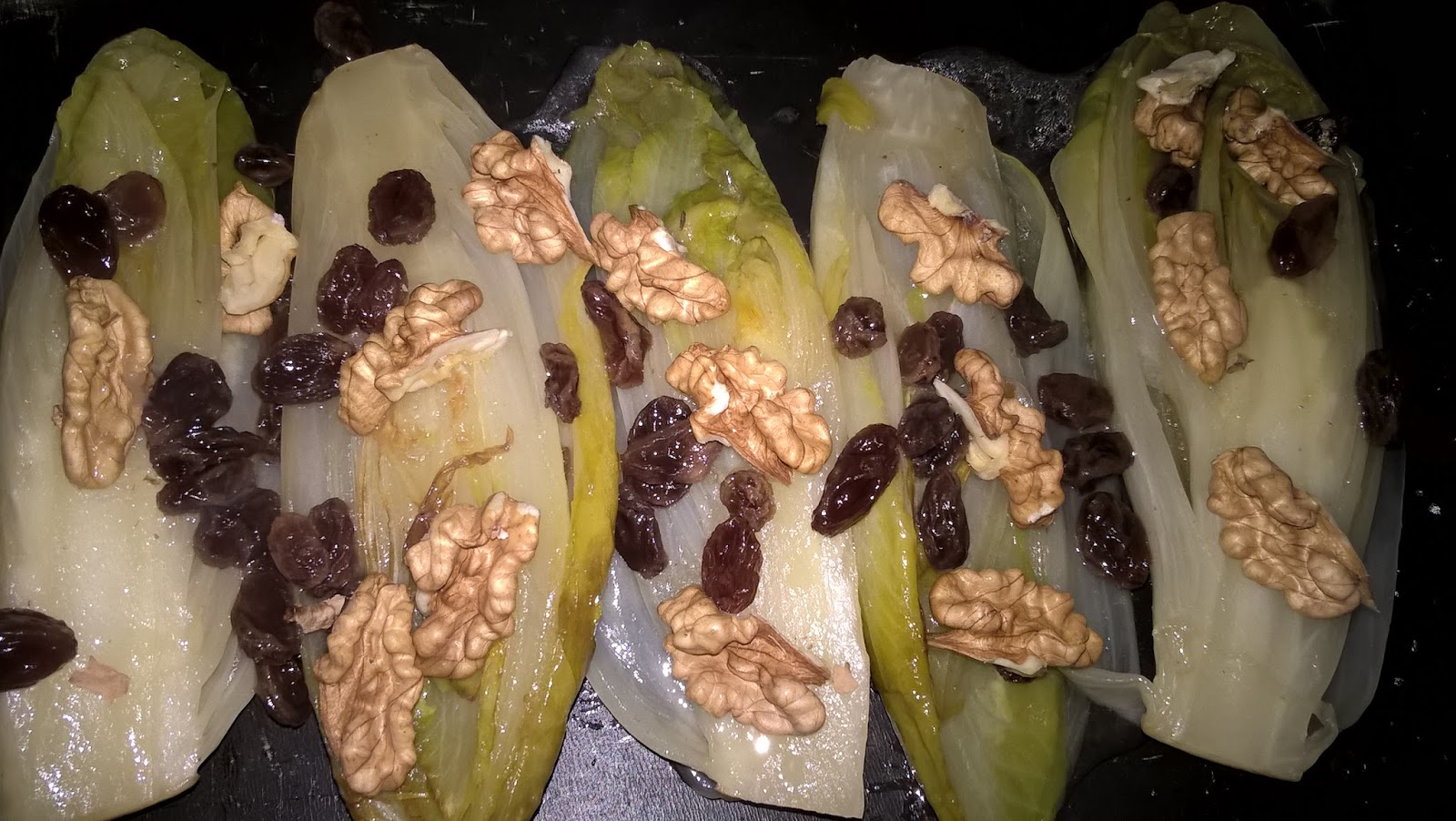 Sistemate l’indivia in una teglia e completate con gherigli di noce.
