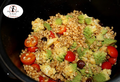 Ora siete pronti per saltare tutti gli ingredienti, azionate il programma SAUTE’, scaldate all’interno l’olio con le olive e lo spicchio d’aglio rosolate per qualche secondo, aggiungete l’orzo, i pomodorini e le cimette del broccolo romanesco; mescolate accuratamente e regolate di sale, pepe o a piacere peperoncino, aggiungete la paprica e mescolate per amalgamare bene i sapori e riscaldare gli ingredienti.