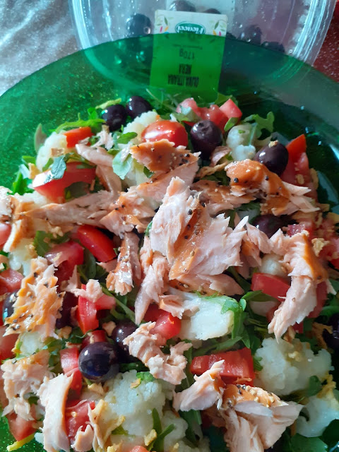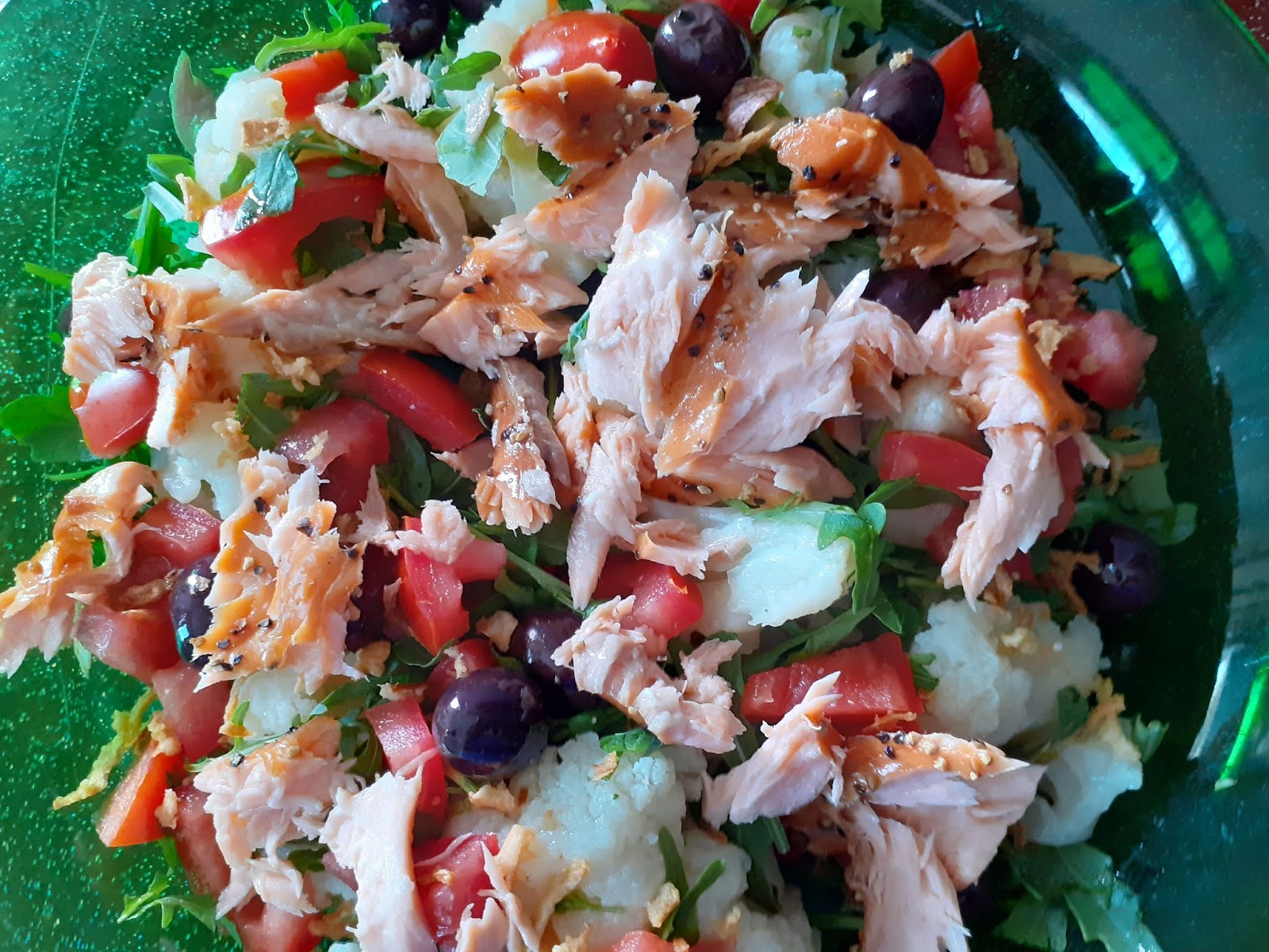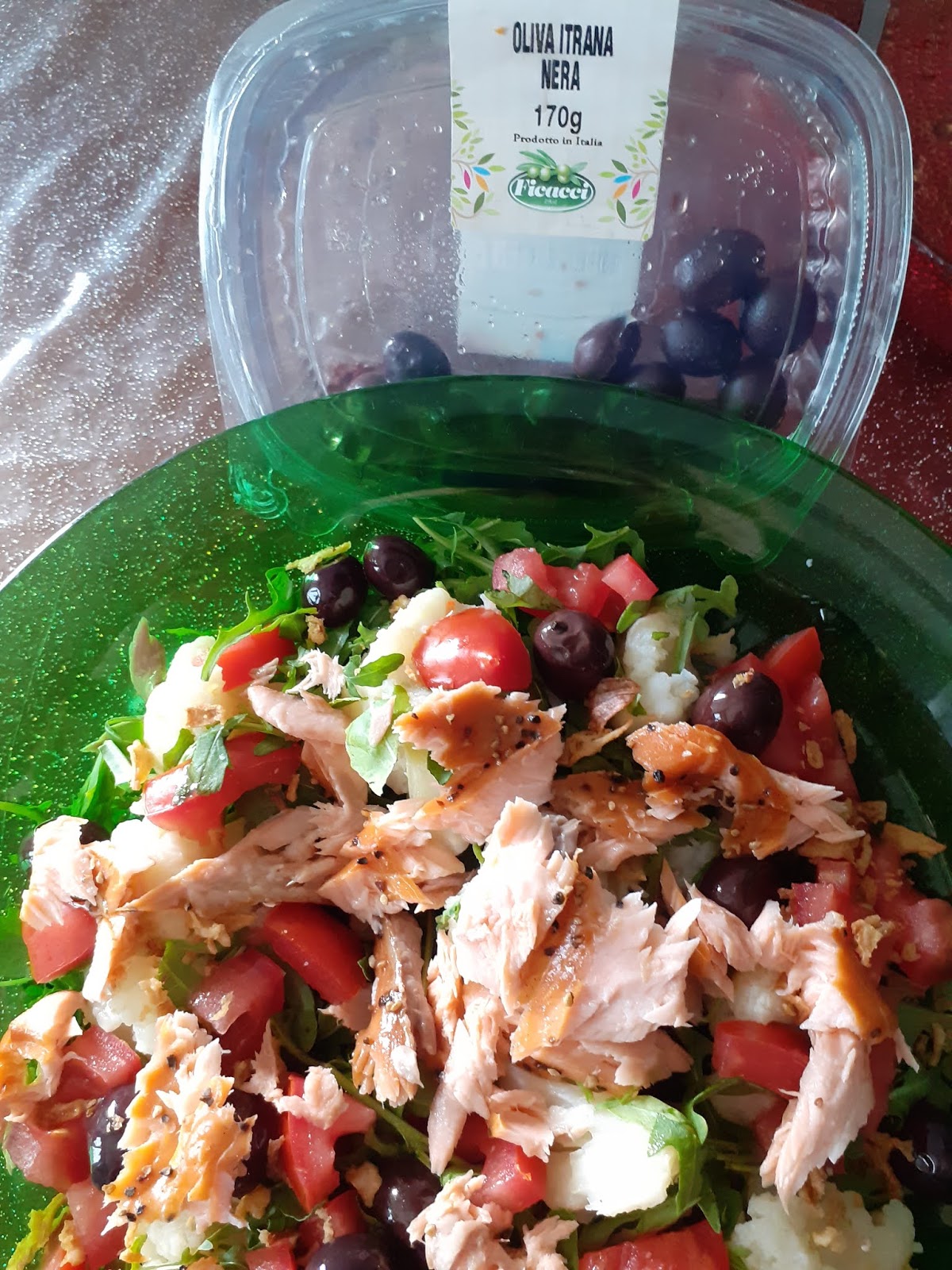 le olive,il salmone,sale ,pepe,olio a filo e succo di limone.Mescolare e servire!