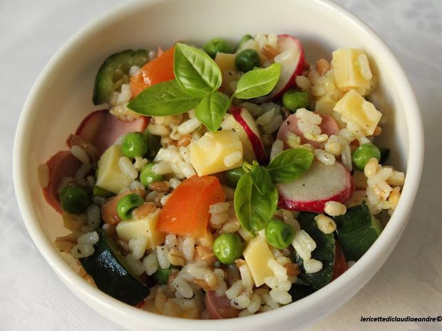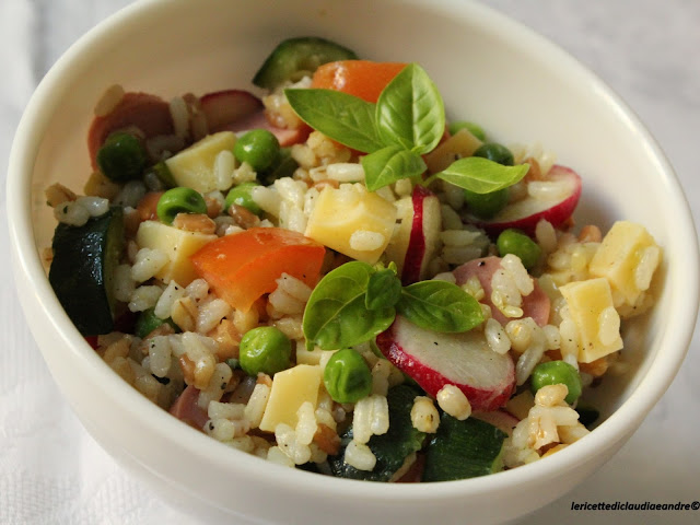 - Una volta freddo, metterlo in una insalatiera e aggiungere tutti gli altri ingredienti tagliati in precedenza.