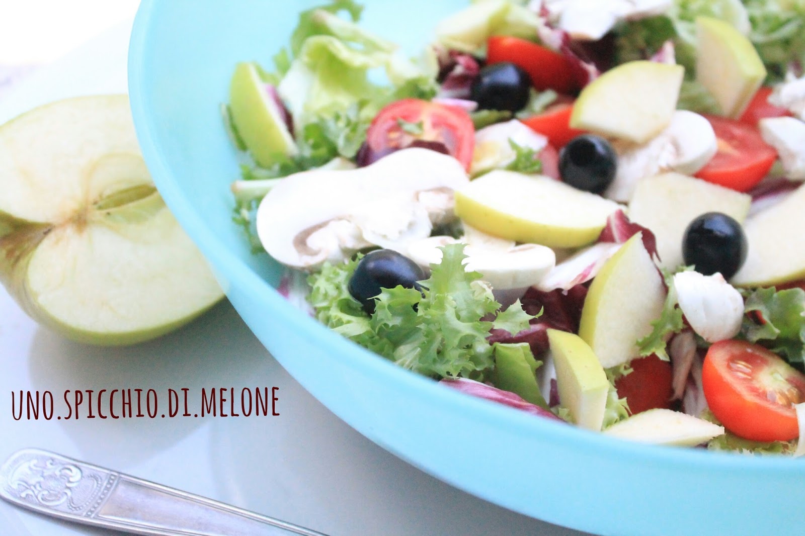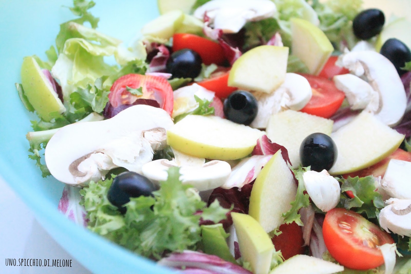 Io ho pensato di farla con una nota un po’ autunnale…ovvero con l’amica mela e i funghi champignon, delicati e gustosi ed il radicchio, intenso e salutare come pochi!