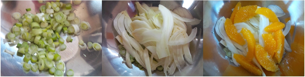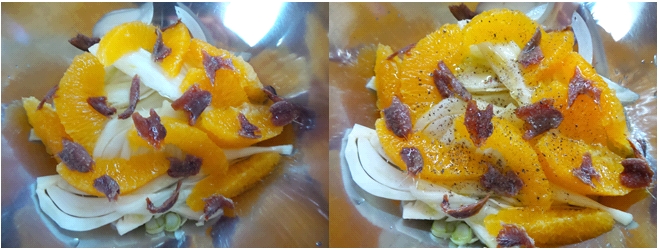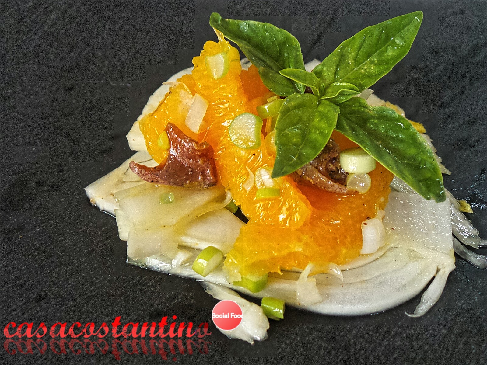 Se servita come piatto unico, cerchiamo di disporre alla base i finocchi sormontati dagli spicchi d’arancia con le acciughe e lo scalogno a completare.