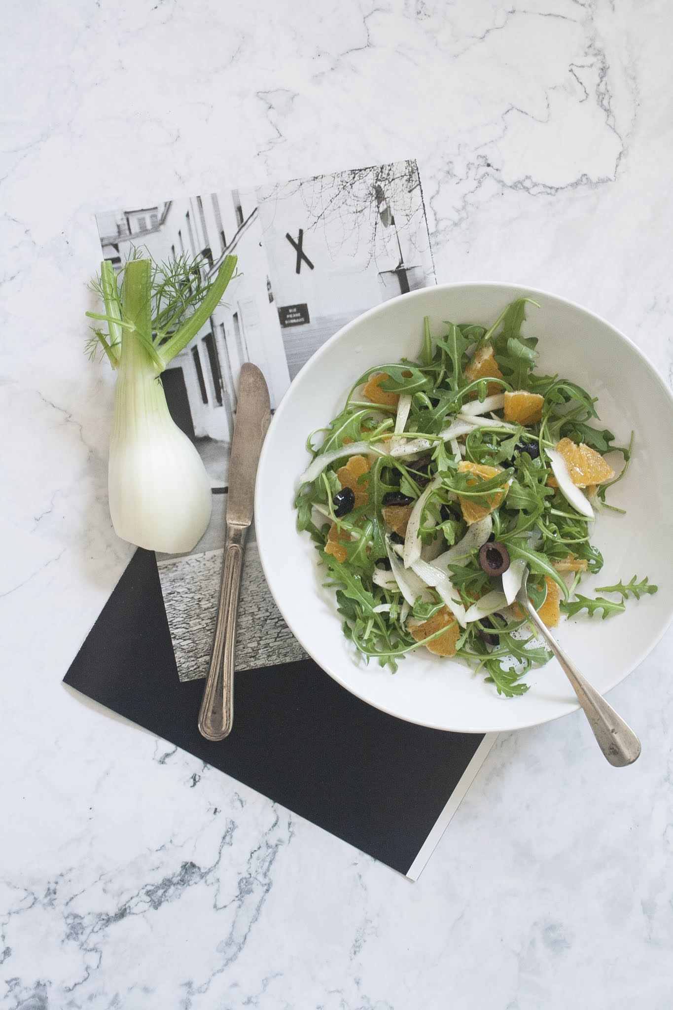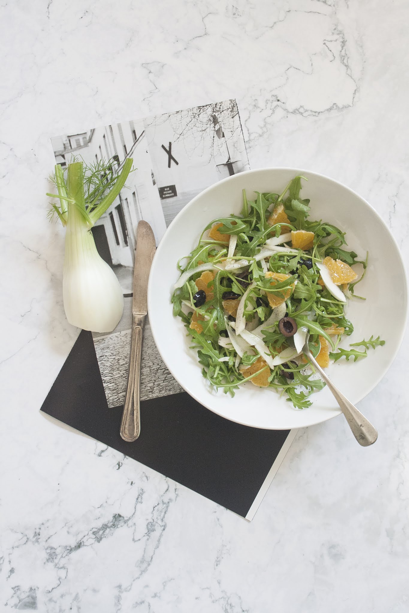 L’insalata di arance, finocchi, olive e rucola è un’insalata vegetariana invernale a basso contenuto di grassi.