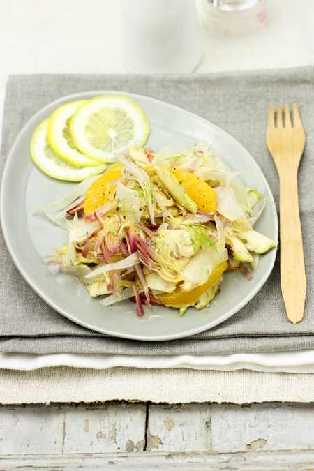 Quest’insalata di carciofi e finocchi mi sembra in linea con i buoni propositi per l’anno nuovo che leggo sparsi qua e la un po’ ovunque, anche se sinceramente io non posso dire di aver mangiato l’impossibile, perché va proprio contro il mio modo di intendere il cibo.