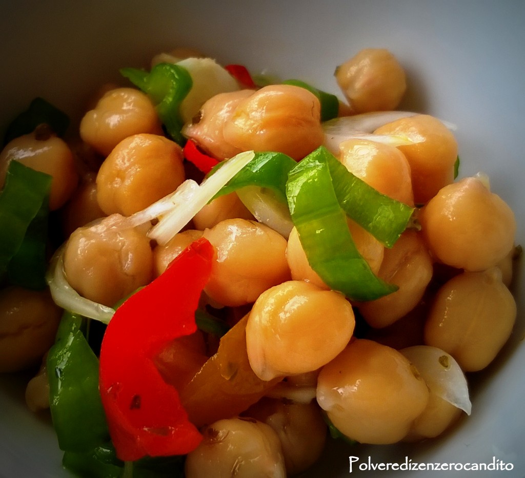 Affettare finemente la cipolla, i peperoncini verdi, aggiungere i peperoni in agrodolce tagliati a pezzi, l’origano ed i condimenti, in ultimo mettere anche i ceci ed il peperoncino se vi piace.