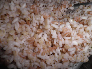 Fate lessare orzo perlato, farro e riso ( decidete la quantità in base alle persone, io ho calcolato 40+40+40). Fate raffreddare e unite i tre cereali.