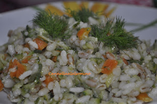 Insaporite i cereali con il condimento. E’ ottima sia tiepida sia fredda. Decorate con barbe di finocchio.