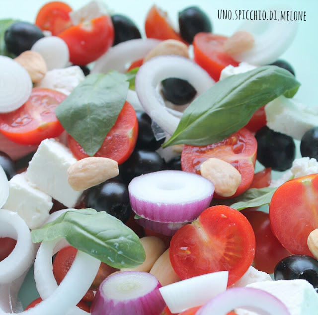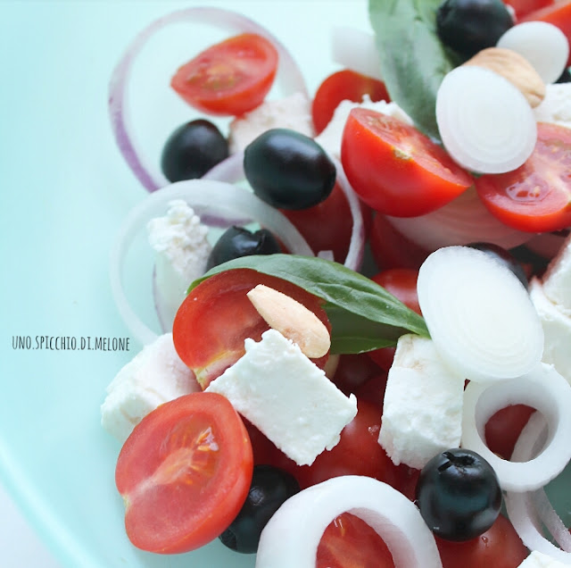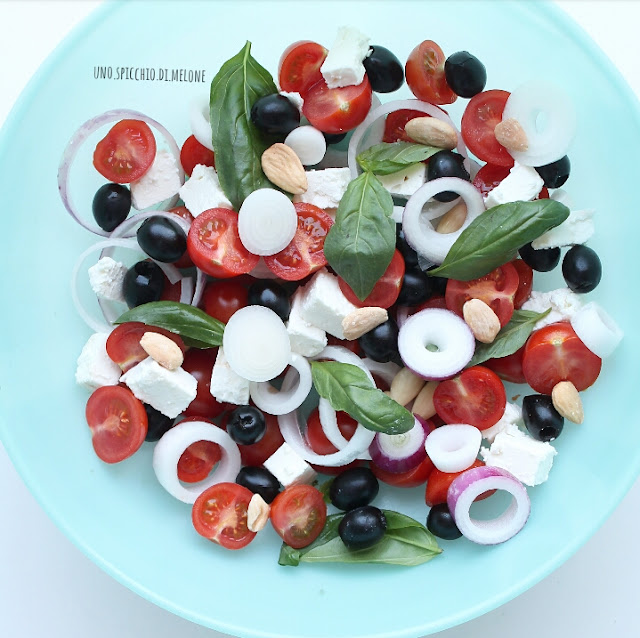 Questa insalata potrebbe essere vista come una sorta di versione numero 1578 della mitica INSALATA GRECA! Ahah! Infatti ci sono i pomodori, le olive nere, la feta e la cipolla.