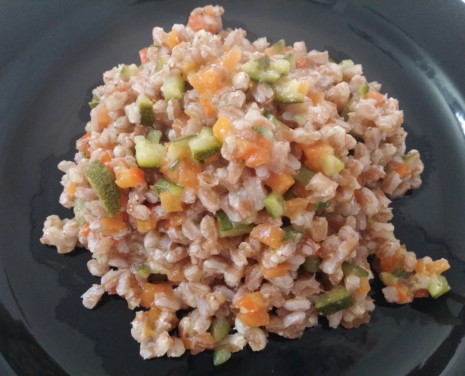 150 gr di farro perlato; 1 zucchina; 1 carota; 1/4 di falda di peperone
