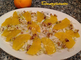 Lavare i finocchi e asciugarli. Tagliarli molto sottili, disporli su un piatto da portata e salarli leggermente. Quindi aggiungere due arance sbucciate e tagliate a fettine, dopo averle pulite bene eliminando tutta la parte bianca. Tostare le noci, tritarle grossolanamente le noci e versarle sopra le arance. Preparare un’emulsione con olio, pepe e il succo dell’altra arancia e irrorare l’insalata.
