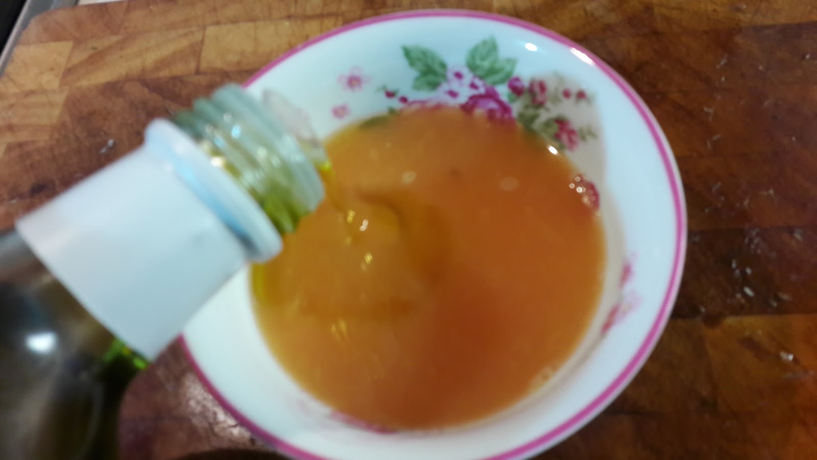 In una ciotolina mescolare il succo dell’arancia, con il succo di mezzo limone e l’olio.