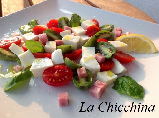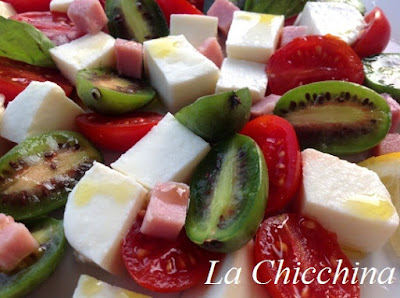 Ancora un piatto che vede come protagonista il NERGI..vi ricordate il piccolo baby kiwi di cui vi ho parlato l’altro giorno? A mio parere il modo migliore per consumarlo, senza alterarne le tantissime proprietà, è a crudo: quindi, perchè non inserirlo in un’insalata colorata e saporita? Detto-fatto, mi sono messa all’opera ed il risultato è questo piatto buono, sano e bello che mescola sapori tipicamente estivi come i pomodorini, il basilico e la mozzarella (oltre al prosciutto cotto) al NERGI, frutto del periodo autunnale.