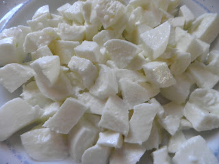 Tagliate la mozzarella a cubetti e fatela sgocciolare bene.
