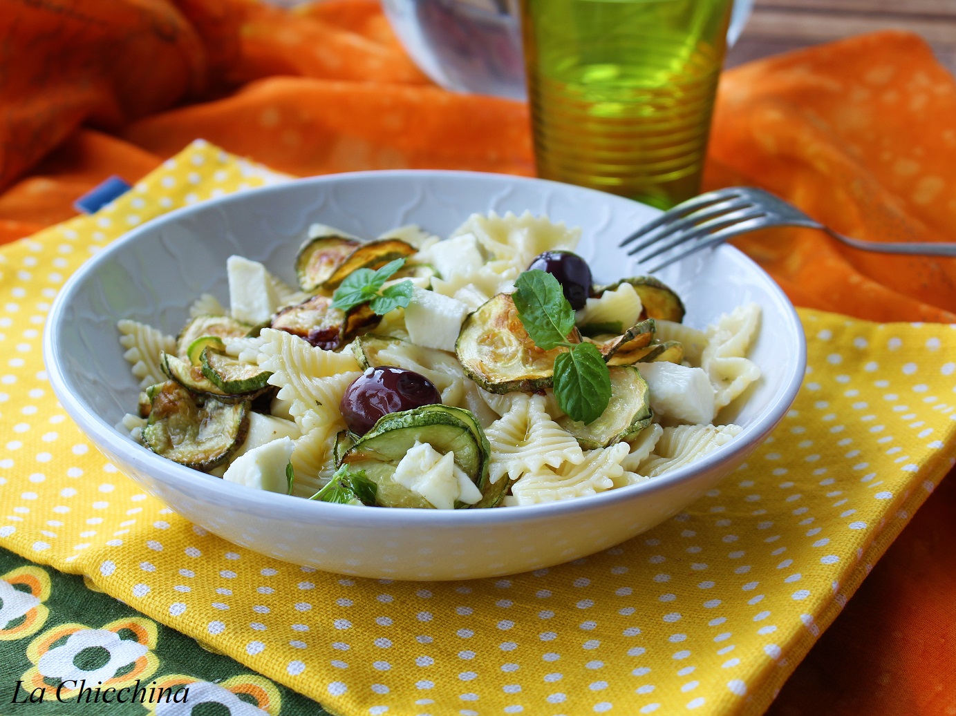 Quella di cui vi voglio parlare oggi è particolarmente golosa ed appetitosa: alla pasta vengono aggiunte zucchine fritte, provolone piccante, mozzarella e olive nere; il tutto viene condito con un olio preparato in anticipo cui vengono aggiunti aglio, foglie di basilico, sale, pepe e un niente di aceto (che regala una nota fresca ed accattivante).