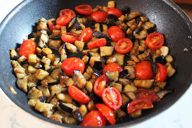 Preparazione: lavare la melanzana e i pomodorini, tagliare la melanzana a cubetti e i pomodorini a metà.