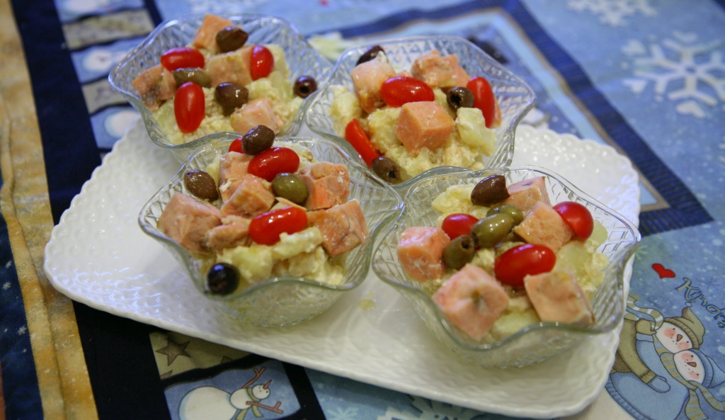Condire le patate con la salsa, aggiungere le olive e i pomodorini e mescolare. Per ultimo il salmone, in modo che non si rompa troppo.