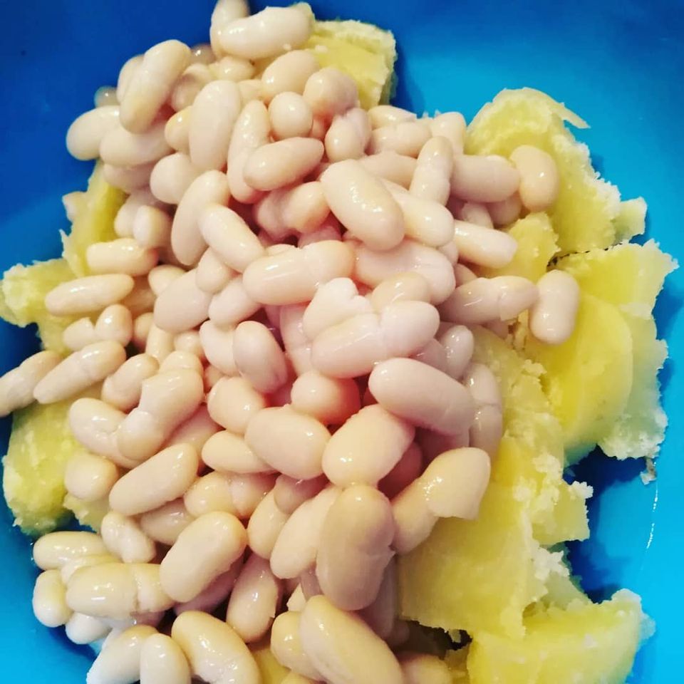 Ho cotto i fagioli dopo averli tenuti a mollo per tutta la notte, li ho messi da parte in una ciotola. Ho scaldato le patate, le ho fatte raffreddare e le ho aggiunte ai fagioli.
