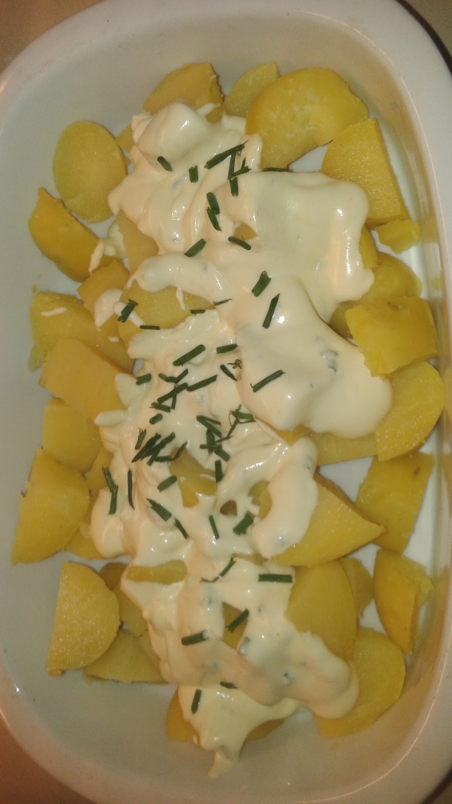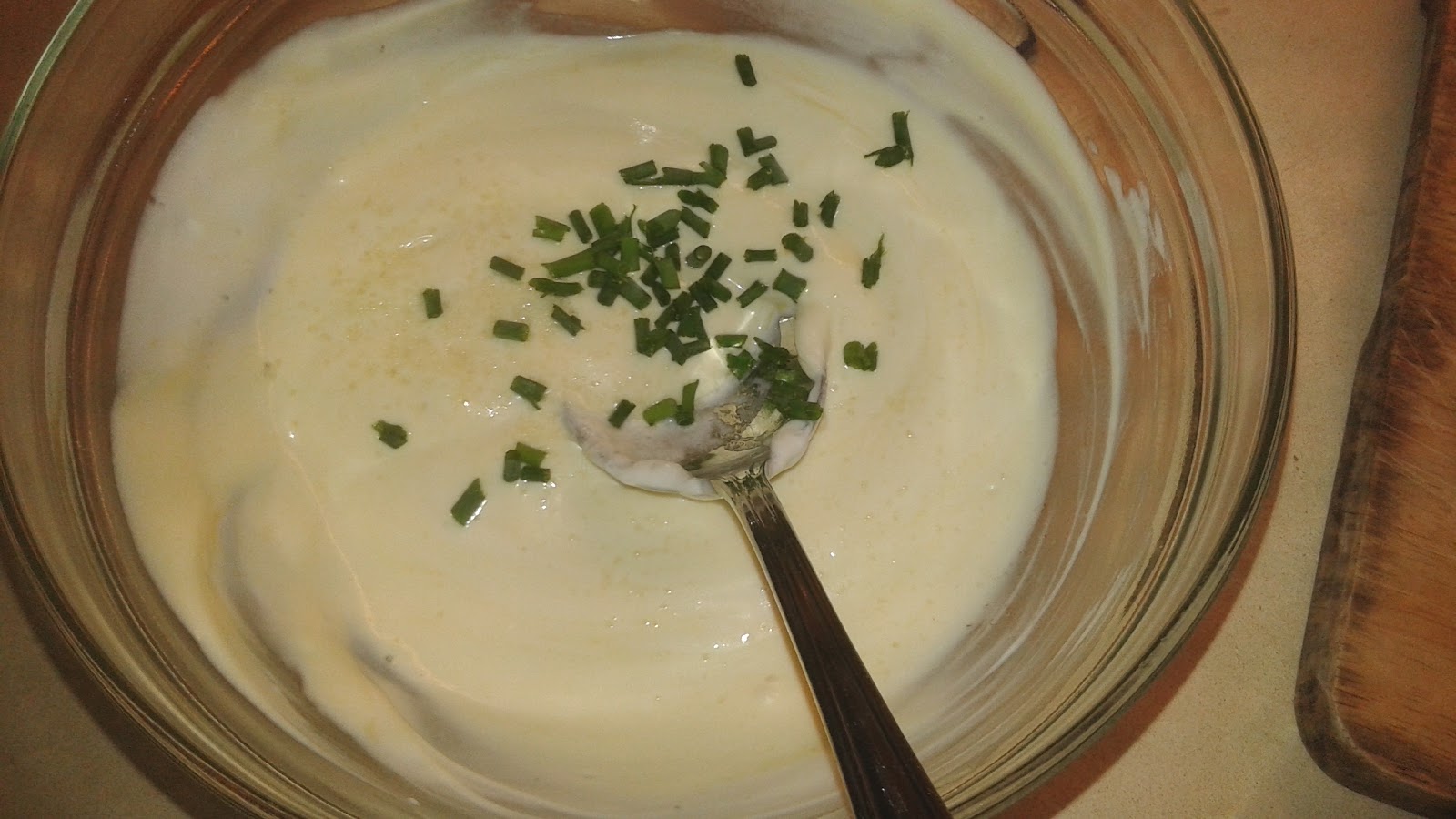 In una ciotola versare lo yogurt, la senape e la maionese e amalgamare il tutto con un cucchiaio. Aggiustare con il sale e pepe a proprio piacimento e versarci dentro metà dell’erba cipollina sminuzzata.