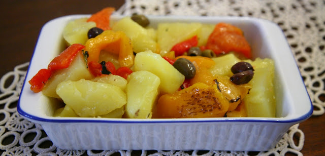 Oggi ho deciso di preparare un’insalata di patate saporita aggiungendo due ingredienti che amo tantissimo: i peperoni e le olive taggiasche.