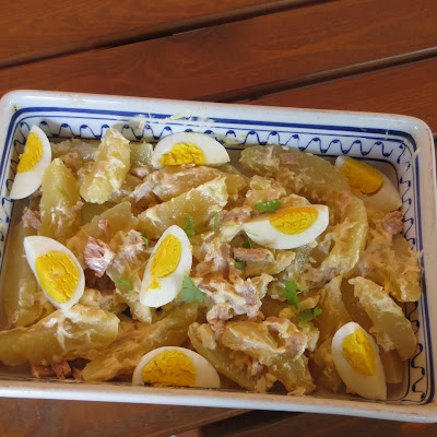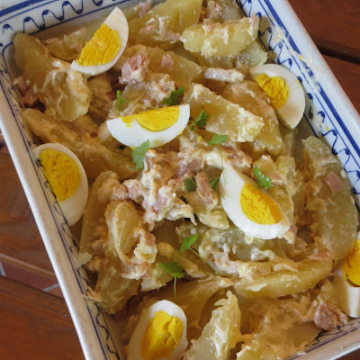 Pelate le patate fredde e tagliatele a tocchetti, aggiungete la maionese, il tonno sgocciolato, il prezzemolo tritato, due cucchiai di olio E.V.O. una presa di sale e pepe, mescolate, impiattate e servite con le uova sode fredde e affettate.