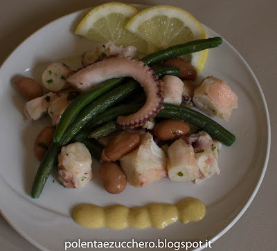 Quando il polipo sarà freddo toglierlo dall’acqua e sgocciolarlo. Tagliarlo a pezzi, dopo aver eliminato le parti più molli e le ventose più grandi, raccogliendo i tranci in una terrina. Unire i fagioli già cotti, i fagiolini tagliati a pezzi più piccoli e un piccolo ciuffo di prezzemolo tritato fine quindi mescolare e condire con un pizzico di sale, poco olio e qualche cucchiaio di aceto bianco (oppure il succo di un limone). Mettere il polipo così preparato in frigo per almeno un’ora.