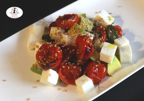Insalata di pomodorini arrosto in friggitrice ad aria con avocado, caprella e sesamo tostato
