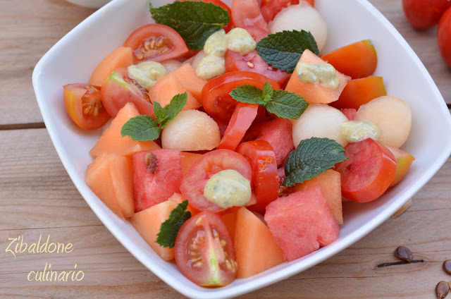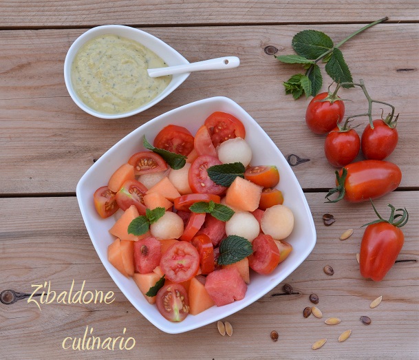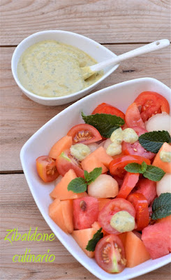 Infatti per l’argomento di oggi di Light and Tasty ”I Pomodori”, non avendo a disposizione tanti colori diversi, ho giocato sul gusto, aggiungendo due tipi diversi di melone e l’anguria. E’ una ricetta che avevo preparato anni fa per Keep Calm e what’s for dinner (conoscete questa pagina vero?), ed era tratta da una rivista (forse Delicius? , ma non ne sono sicura) ricordo invece la freschezza di questa insalata e vi assicuro che nei giorni più caldi è davvero una benedizione! Complice anche la salsa d’accompagnamento che con la menta e il sambuco è davvero deliziosa… non vi resta che provare a duplicarla!!