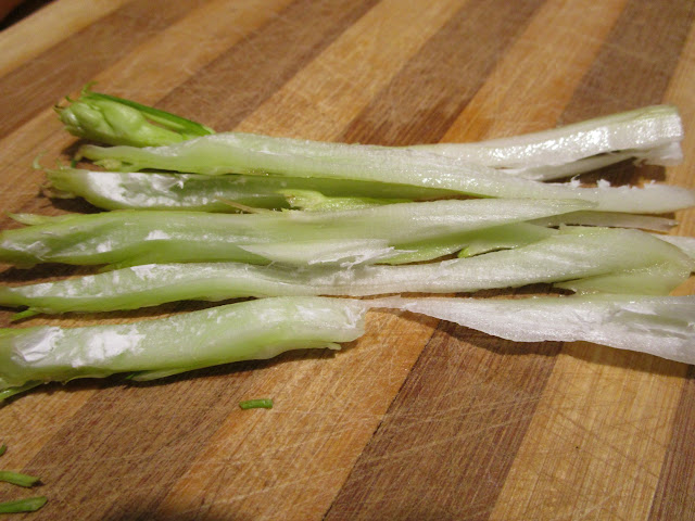 - mondare le puntarelle e ricavare la quantità necessaria tagliandole a julienne
