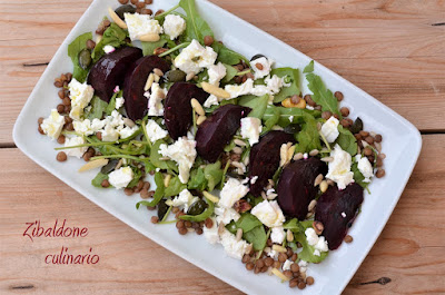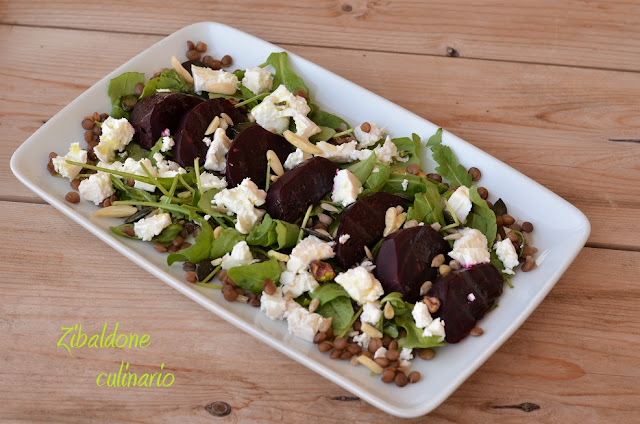 Preparare il piatto mettendo alla base le lenticchie, aggiustare di sale, aggiungere la rucola, le rape rosse e la feta sbriciolata. Condire con il dressing al miele e cospargere con i semi misti.