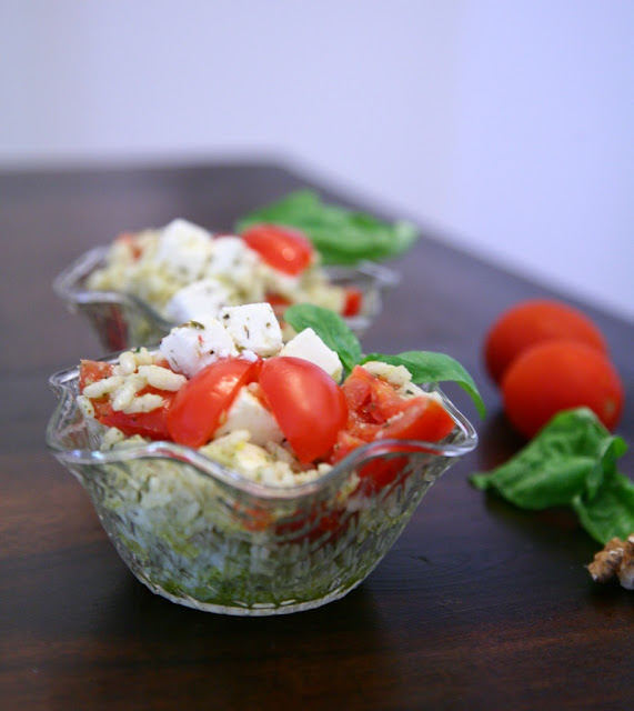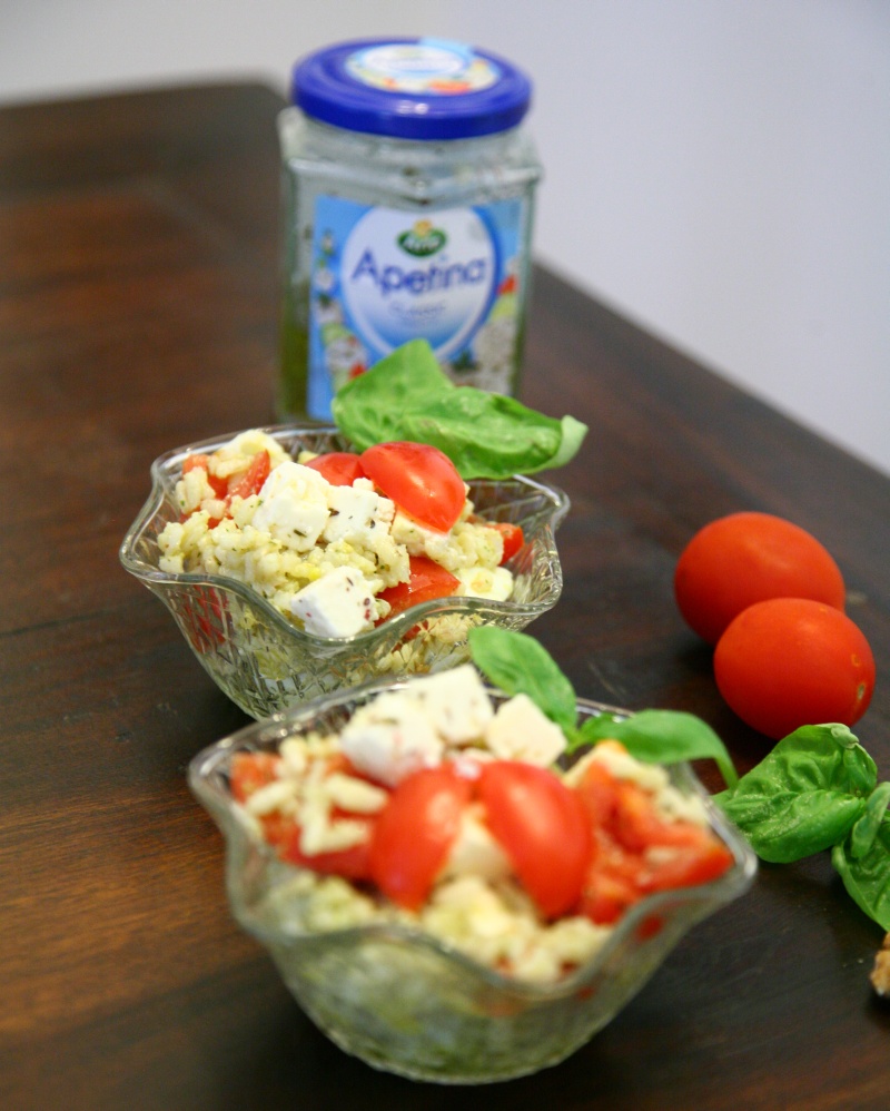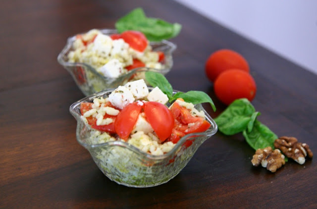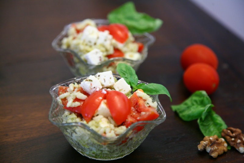 Condire il riso freddo con il pesto, aggiungere i pomodorini e la feta tagliata a quadretti.