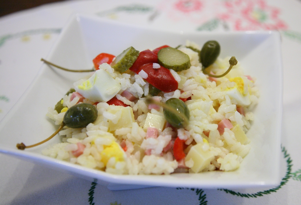 Oggi un’ insalata di riso un po’ tedesca grazie alla presenza dei cetrioli in agrodolce, le uova e una vinaigrette realizzata con la senape.