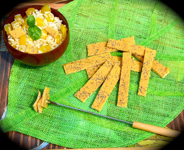 Un’altra delle mie pause pranzo piene di gusto: un’insalata di riso integrale, semplicemente condita con dei peperoni gialli, olio extravergine di oliva e basilico. Per accompagnarla abbiamo una farinata di ceci e piselli, fatta con il 50% di farina di piselli e 50% di farina di ceci, e tanti semi di papavero.