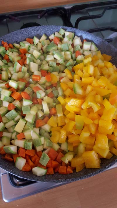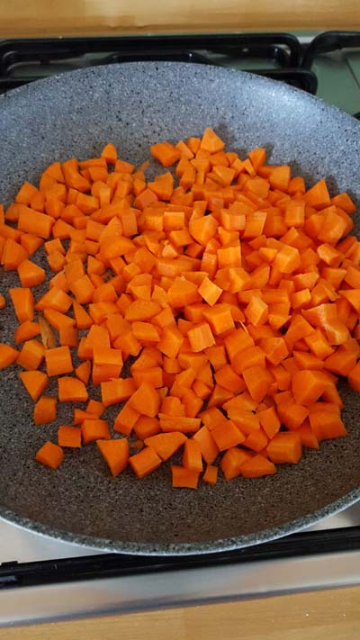 Tagliare le carote a dadini e farle soffriggere con un filo d’olio in una padella capiente per circa 5 minuti,