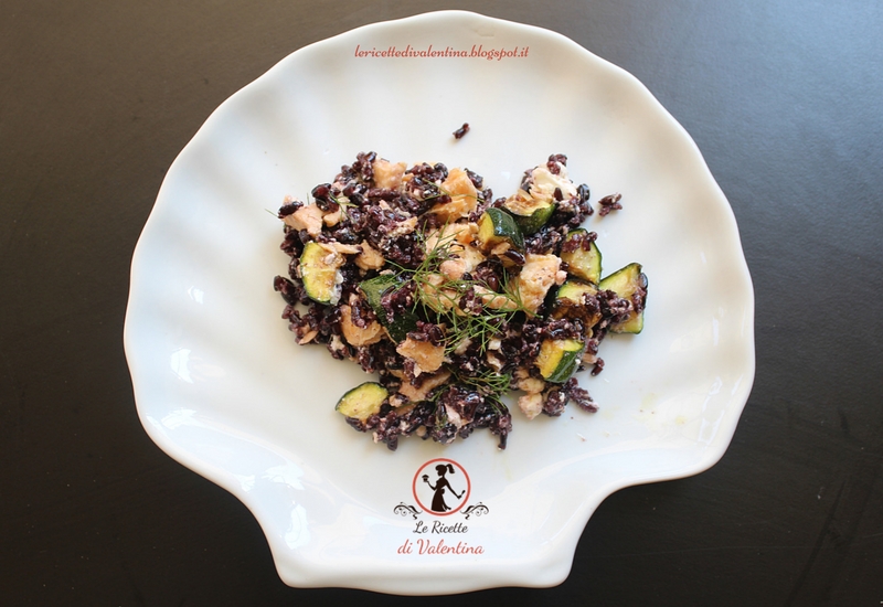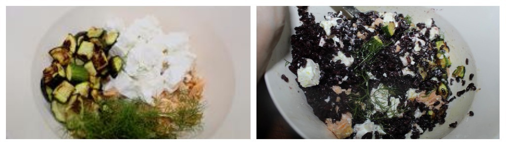 In una ciotola sfilettate il salmone ben sgocciolato con una forchetta, sbriciolate con le mani la feta, aggiungete le zucchine, il finocchietto spezzettato a mano e il riso Venere. Condite con l’olio, sale e pepe a piacere, la scorza grattugiata del limone e il suo succo. Mescolate bene e lasciate insaporire almeno 30 minuti prima di servire.