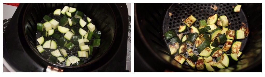 Lavate e spuntate la zucchina e tagliatela a cubetti, inseriteli nel cestello della friggitrice ad aria e cuocete per 10 minuti a 200 gradi scuotendo di tanto in tanto il cestello in modo da rigirare cubetti. Una volta cotti fate raffreddare anch’essi.