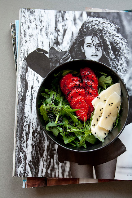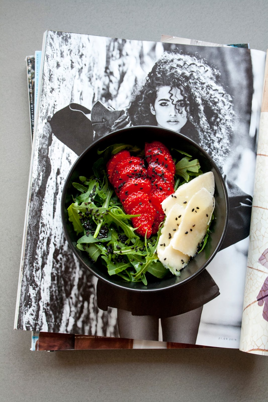 Combine in a salad bowl the strawberries with arugula and flakes of Parmesan cheese.