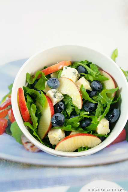 Sistemarla sul piatto da portata aggiungendo le fette di mela, i mirtilli e il formaggio Bergader tagliato a cubetti.