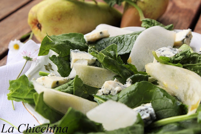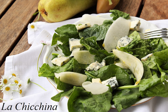 Tornando alla nostra insalata, è tanto insolita quanto gustosa: spinaci freschi, gorgonzola piccante e pere, il tutto condito con il condimento greco.