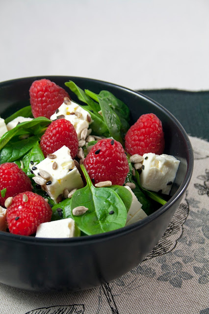Dopo il post di ieri sui benefici dei lamponi, oggi m’era venuta voglia di comperarmene una vaschetta. Non avevo intenzione di accendere il forno anche oggi, sicché questa insalata è nata così, senza pensarci più di tanto.