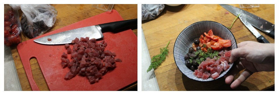 Lavate il finocchietto e il pomodoro. Tagliate con un coltello affilato il tonno in cubetti di 1 cm circa, fate la stessa cosa con il pomodoro. per quest’ultimo usate un coltello seghettato così farete meno fatica. Mettete tutti gli ingredienti in una ciotola, aggiungete il finocchietto strappato con le dita in piccoli pezzi, grattugiate la scorza di limone e condite con il succo, l’olio, sale e pepe a piacere.
