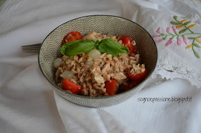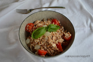 Finché cucinate il farro a parte tagliate i pomodorini e le foglie di basilico, sgocciolate lo sgombro, le cipolline e condite il tutto con un goccio d’olio d’oliva.