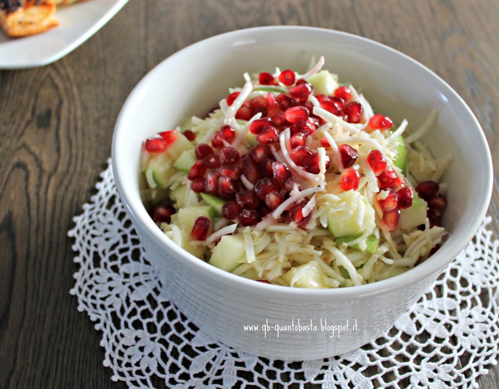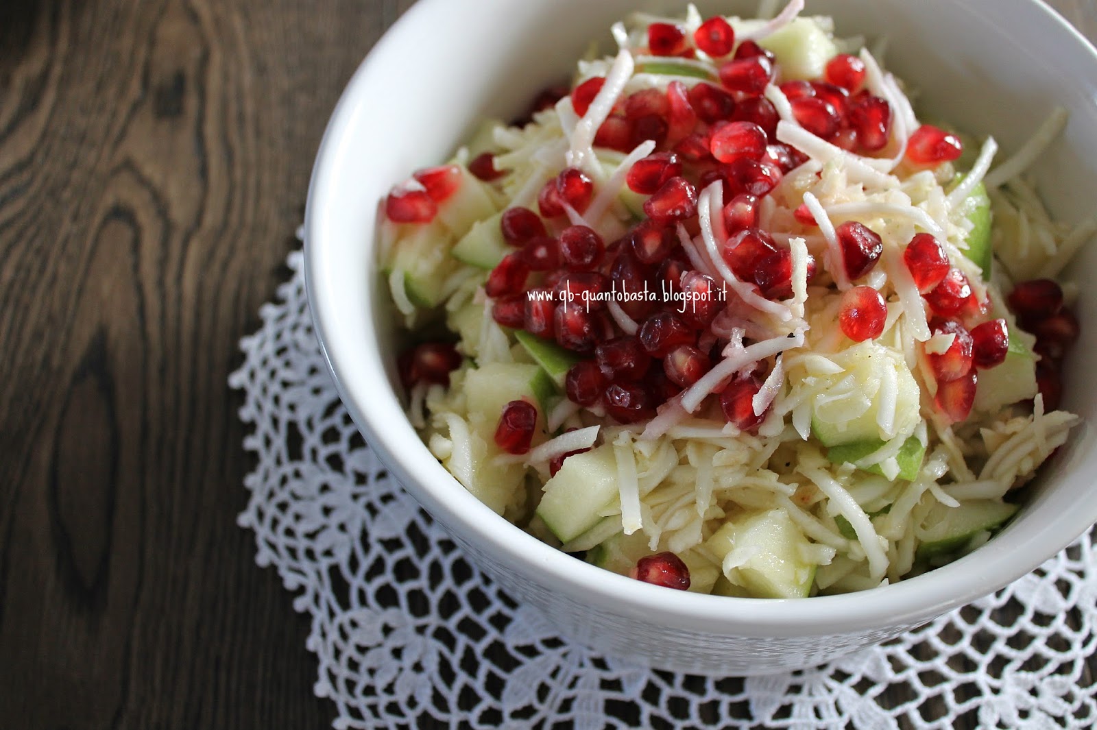 5. Unire la mela al sedano rapa, condire con olio, sale e pepe e la buccia del lime tenuta da parte. Mescolare e per ultimo aggiungere i chicchi di melograno. Se li mettere prima lasceranno il loro colore rosso sugli altri ingredienti.