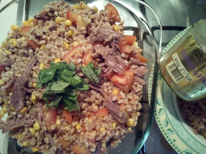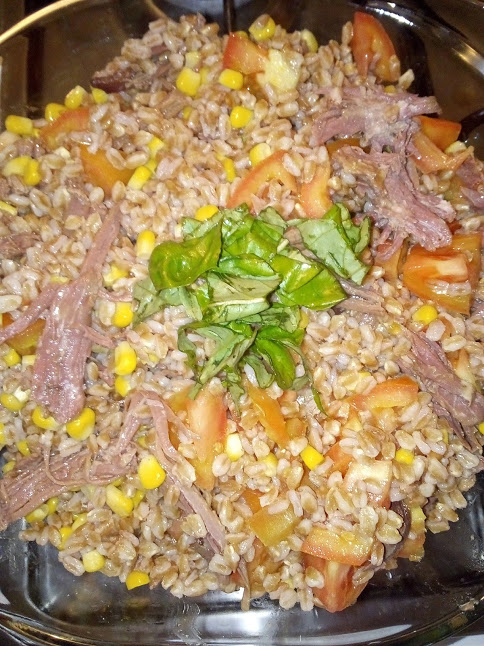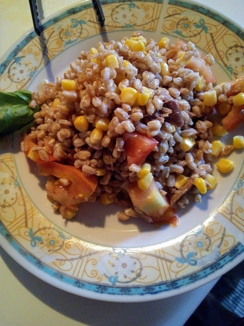 Nel frattempo, in un insalatiera preparate i pomodori, precedentemente lavati e tagliati a dadini, il mais ed in fine il farro.