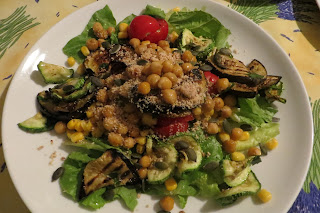 Insalata verde, pomodorini, verdure grigliate (melanzane, peperoni e zucchine), mais, farina di mandorle, ceci croccanti, semi di zucca.