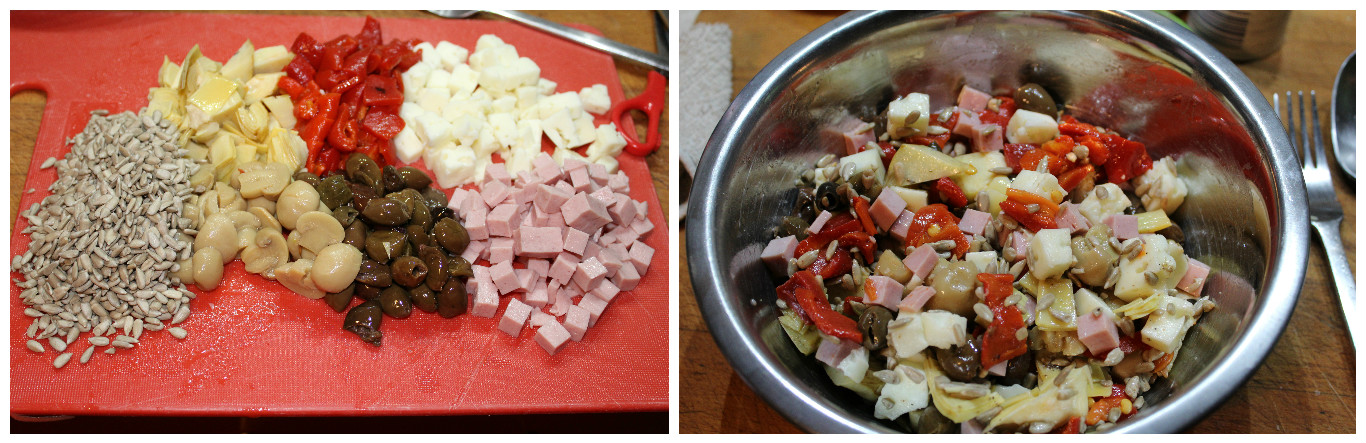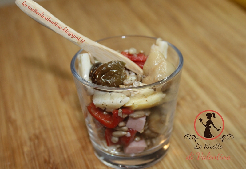 Forse l’avrete capito che non amo pesare gli ingredienti, cerco sempre il modo di semplificare il più possibile i dosaggi delle mie ricette, usando come unità di misura cucchiai e tazze. Quest’antipasto nasce proprio per questa mia deformazione, basterà quantificare il primo ingrediente e aggiungere tutti gli altri nelle stesse proporzioni tranne il condimento che va a piacere.