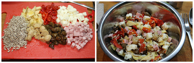 Riduceteli in pezzi più o meno grossi come i cubetti di prosciutto e unite tutto in una ciotola, condite a piacere e mescolate bene.