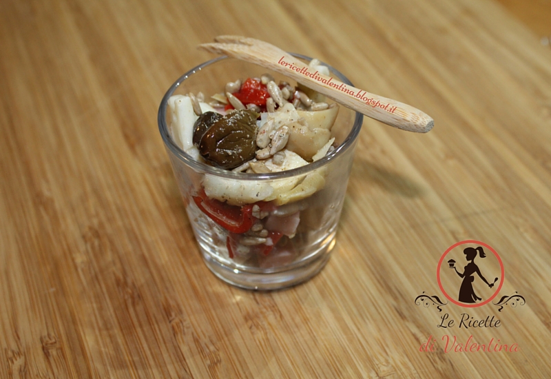 Potete servire questa insalatina in bicchierini trasparenti con una forchettina, un modo carino di presentare questo piatto semplice che non ha bisogno di particolari doti culinarie ma soltanto una dispensa ben fornita.