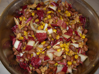 Cuocere i fagioli per 1 ora e 1/2, dopo averli tenuti in ammollo per 1 notte. Eliminare l’acqua di cottura. Affettare il radicchio ed un po’ di cipolla sottilmente ed unirli ai fagioli. Aggiungere anche il mais, in alternativa si possono anche lessare delle pannocchie fresche, ancora più buone. Aggiungere le noci e grattugiare un po’ di curcuma fresca. Aggiungere un pizzico di sale ed un filo d’olio e mescolare.